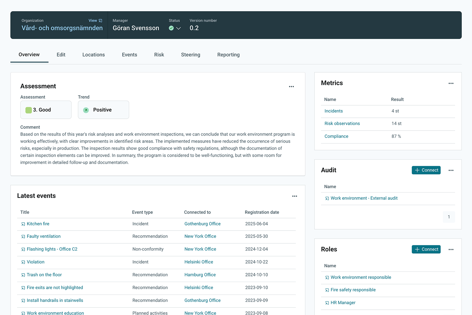 • Compliance support for the Swedish Work Environment Act, AFS, and ISO 45001