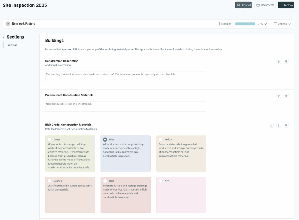 Inspection - Inspections are often used within the insurance industry as a basis for insurance premiums. The inspection is often carried out by an authorized risk engineer who analyzes the business, facility, or factory based on a set of questions. Each question is weighted based on the response alternatives, and a so-called risk score is calculated for the facility. Recommendations, deviations, and evidence can also be linked to each question. An EML (Estimated Maximum Loss) value is calculated, which serves as the basis for the insurance premium.