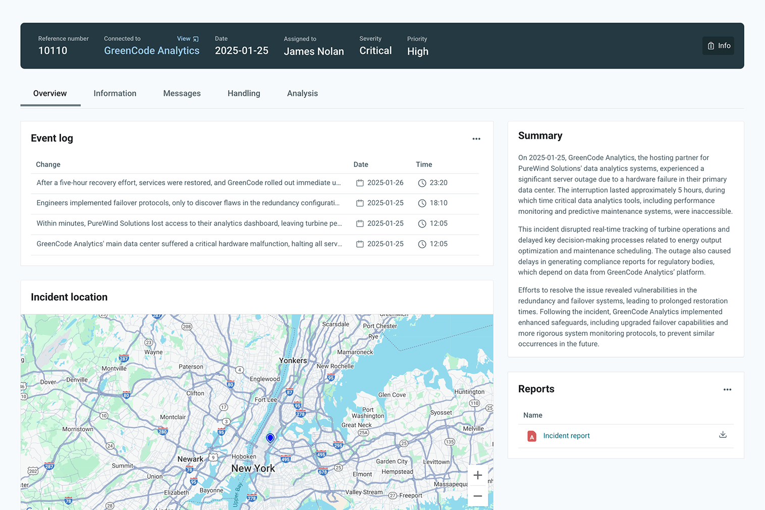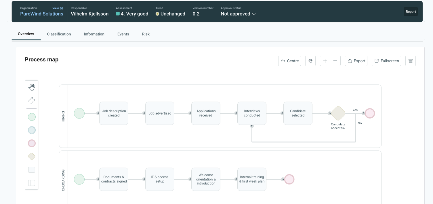 Insurance and claims management is handled as a management system. All parts of the information model can be linked to each other and visualized in a graph, e.g., an incident linked to a process and a risk.