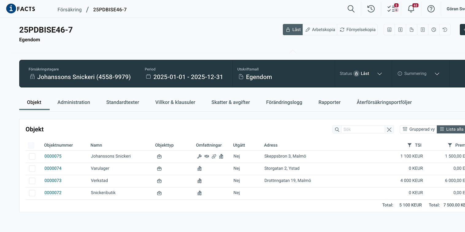 I integrerade arbetsflöden hanteras samtliga delar; försäkring med förnyelseprocess, fakturering, skadehantering, besiktningar & inspektioner samt rapporteringsstöd. Allt samlat i ett modernt webb-baserat system.