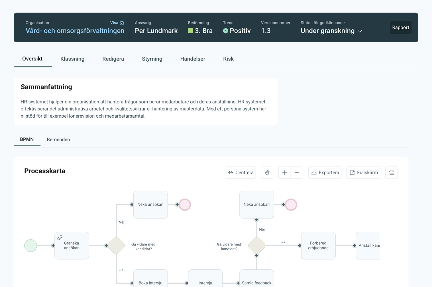 Bygg grafiska samband mellan t.ex. leverantörer, processer och risker. Med beroendegrafer får du visuell spårbarhet i hela din verksamhet.