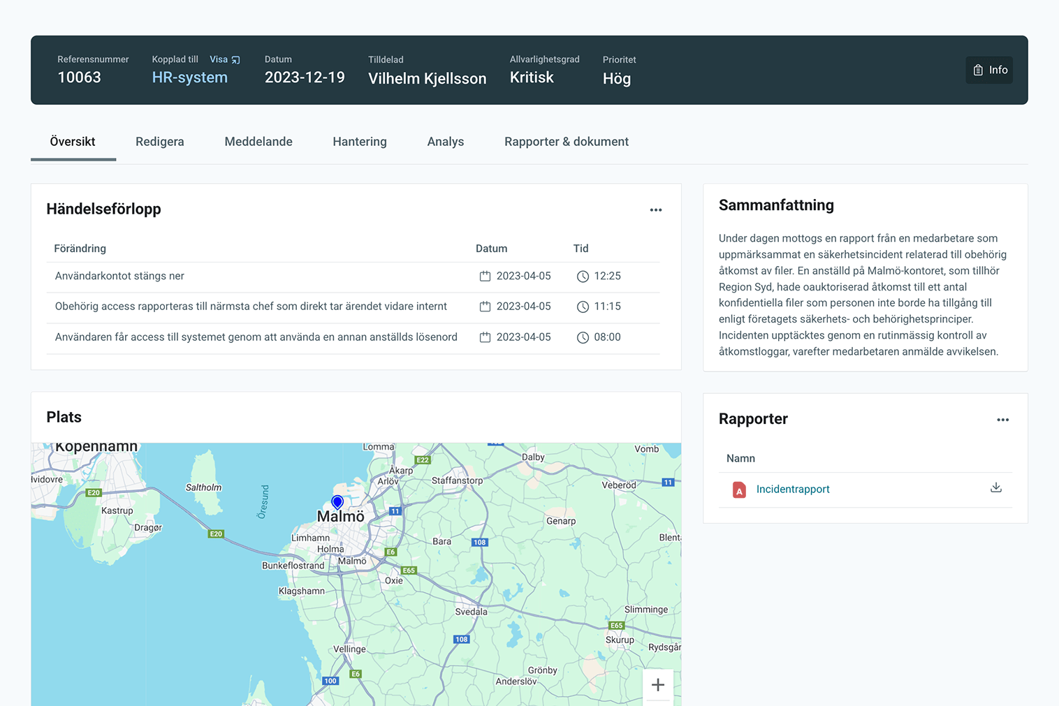 Konnektivitet är en central funktion – incidenter kan kopplas till andra delar av organisationen, externa parter, tillgångar, processer, relaterade incidenter och risker, vilket ger en fullständig överblick och förståelse för händelsens påverkan.